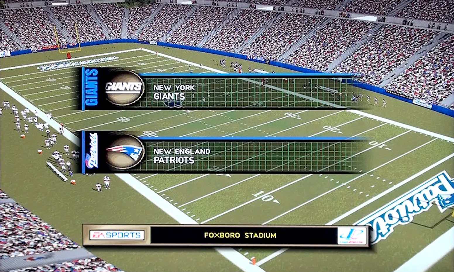 Madden NFL 2000 classic game rivalry with the New York Giants at the New England Patriots. The opening betting line on the game was the New England Patriots -5.5 at home and the O/U was 44.5. The Patriots vs. Giants rivalry has been played 15 times (including 2 postseason games), with the New England Patriots winning 8 games. With the New York Giants winning 7 games. The Patriots lead the overall series, 8–7. The two teams met twice in the Super Bowl, both won by the Giants.