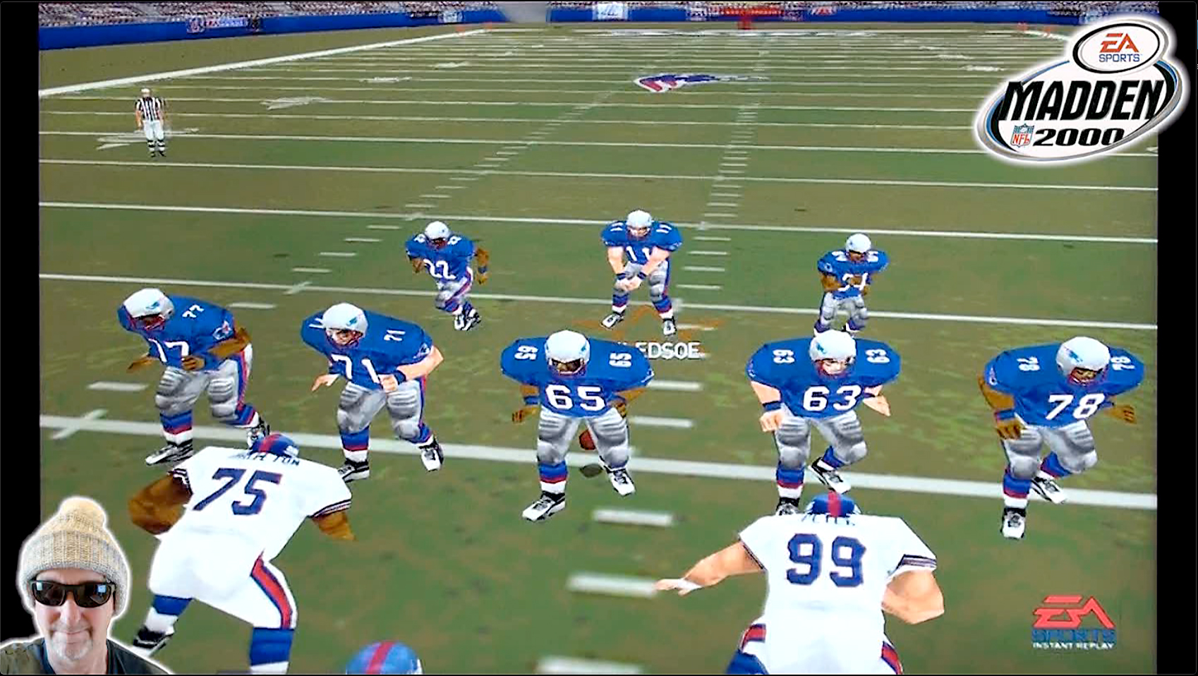 Madden NFL 2000 is a football video game developed by EA Tiburon. It was launched by EA Sports in 1999 for various platforms like PlayStation, Nintendo 64, and Microsoft Windows. Aspyr Media also released a version for Macintosh OS, making it the first football game ever adapted for Mac. In the first game of the 2000 season, the New York Giants face off against the New England Patriots. This video is shown on the Macintosh.